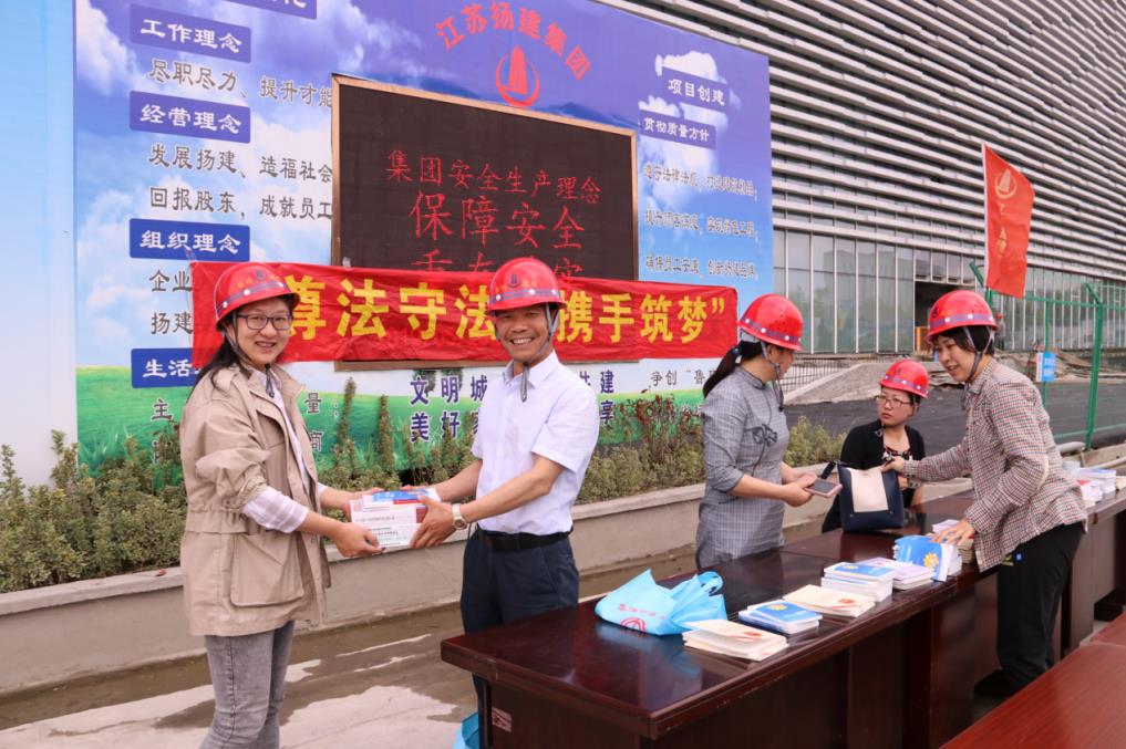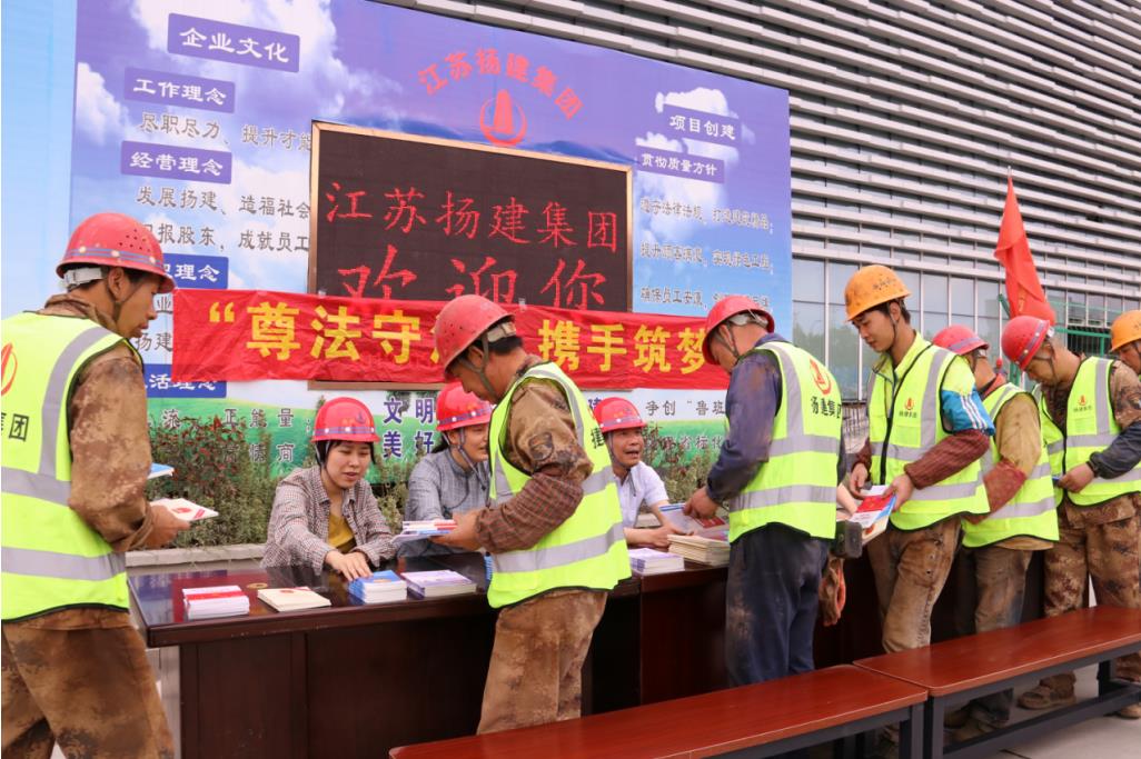 揚建網訊 為了讓農民工能尊法守法,且能用法律武器維護自己的合法權益,市總工會開展了送法下工地活動 。28日下午,市總工會法工部郭永忠部長帶領揚州市總工會律師顧問一行4人,深入到我集團承建的揚州市大劇院項目部施工現場,開展“尊法守法·攜手筑夢”宣傳活動。