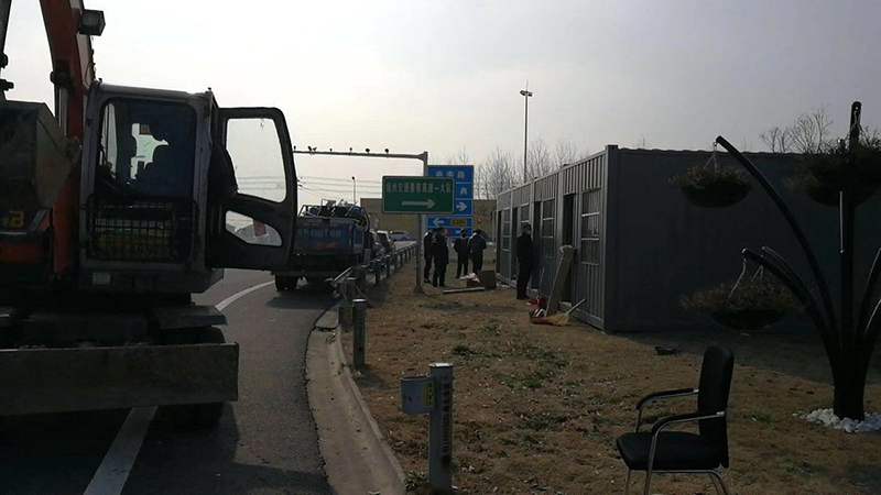 又訊:正月初五下晚,揚(yáng)州生態(tài)新城領(lǐng)導(dǎo)找到我集團(tuán)一公司,要求我方安排四個(gè)集裝箱到滬陜高速G40杭集出口,放在醫(yī)務(wù)人員測溫檢查房旁邊,用于隔離異常人員。箱子要放在綠化帶斜坡上,需要拆除隔離帶,做一條通道,把挖機(jī)開進(jìn)去,平整好之后放上去;并把箱子用油漆外圍出新,里面打掃好,做相應(yīng)改造,接上水電、洗手池,放上桌椅、油汀、水壺水瓶。
