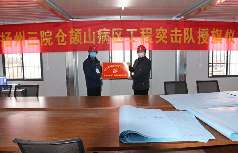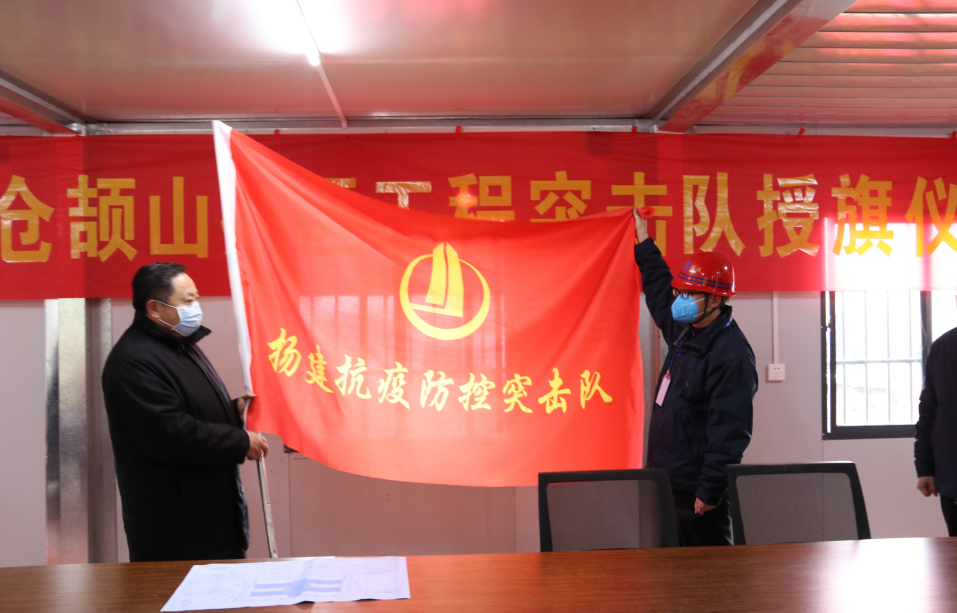 王主任在向我集團蒼頡山病區(qū)項目臨時黨支部書記、揚建抗疫防控突擊隊隊長郝敬東授旗,并希望揚建抗疫防控突擊隊能夠克服一切困難,始終發(fā)揚揚建人特別能吃苦、特別能戰(zhàn)斗、特別能奉獻的精神,牢固樹立龍頭企業(yè)的使命意識、擔(dān)當意識,確保高質(zhì)量、高效率完成市委市政府交辦的建設(shè)任務(wù),為疫情防控做貢獻。
