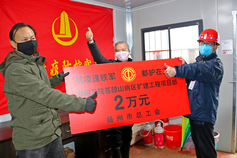 揚建微訊 2月15日下午,揚州市建設(shè)工會范華主任受市總工會黨組書記李春國的委托,看望慰問我集團揚州三院蒼頡山病區(qū)擴建工程項目部骨干員工。我集團黨委副書記、工會主席張振新,集團副總經(jīng)理、擴建工程項目部臨時工會主席郝敬東陪同。范華主任向我集團奮戰(zhàn)在“抗疫”施工一線的骨干員工表示慰問,并向擴建工程項目部臨時工會委員會送來了2萬元疫情防控專項慰問金。