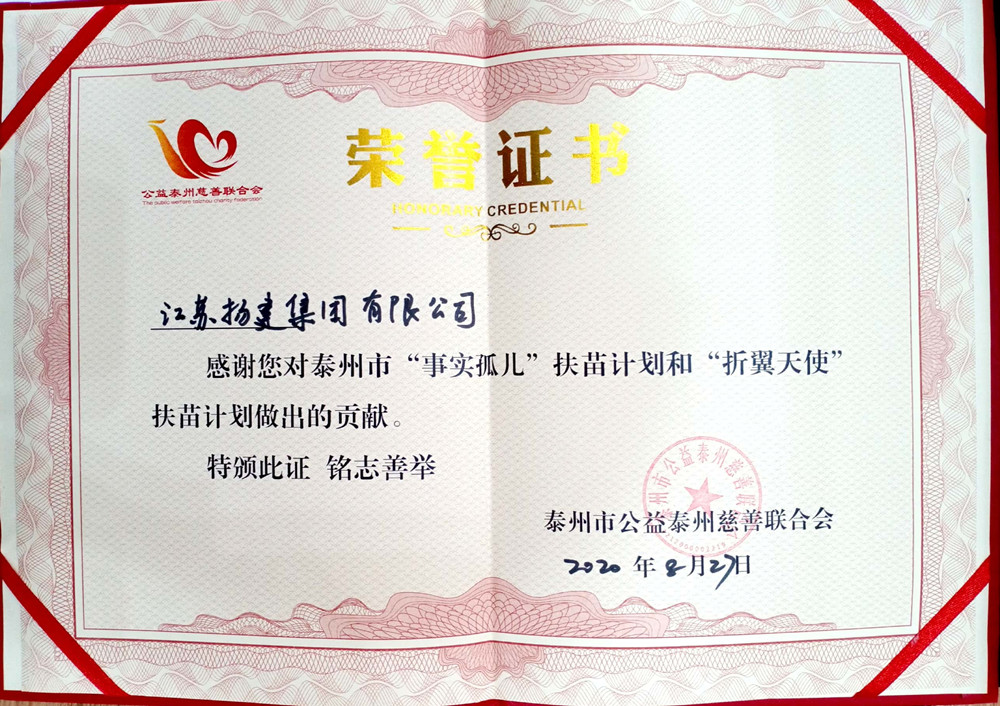 揚建網(wǎng)訊 8月27日,集團公司積極參與泰州市“事實孤兒”扶苗計劃和“折翼天使”扶苗計劃,受到泰州市公益泰州慈善聯(lián)合會的表彰。