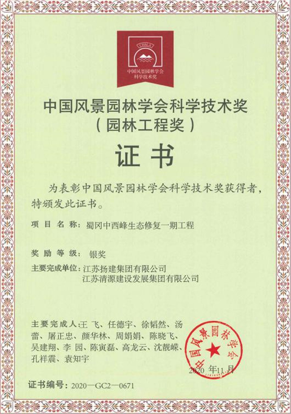 揚(yáng)建網(wǎng)訊 近日,集團(tuán)公司主申報(bào)的“蜀岡中西峰生態(tài)修復(fù)一期工程”獲得了中國風(fēng)景園林學(xué)會(huì)授予的“2020年度中國風(fēng)景園林學(xué)會(huì)科學(xué)技術(shù)獎(jiǎng)(園林工程獎(jiǎng))銀獎(jiǎng)”。風(fēng)景園林科技獎(jiǎng)獎(jiǎng)勵(lì)對象為在推動(dòng)我國風(fēng)景園林各領(lǐng)域科技進(jìn)步、科技創(chuàng)新和科技推廣中做出突出貢獻(xiàn)的單位和個(gè)人,該獎(jiǎng)項(xiàng)也是集團(tuán)公司施工的園林綠化項(xiàng)目在風(fēng)景園林科技領(lǐng)域獲得的最高獎(jiǎng)項(xiàng)。