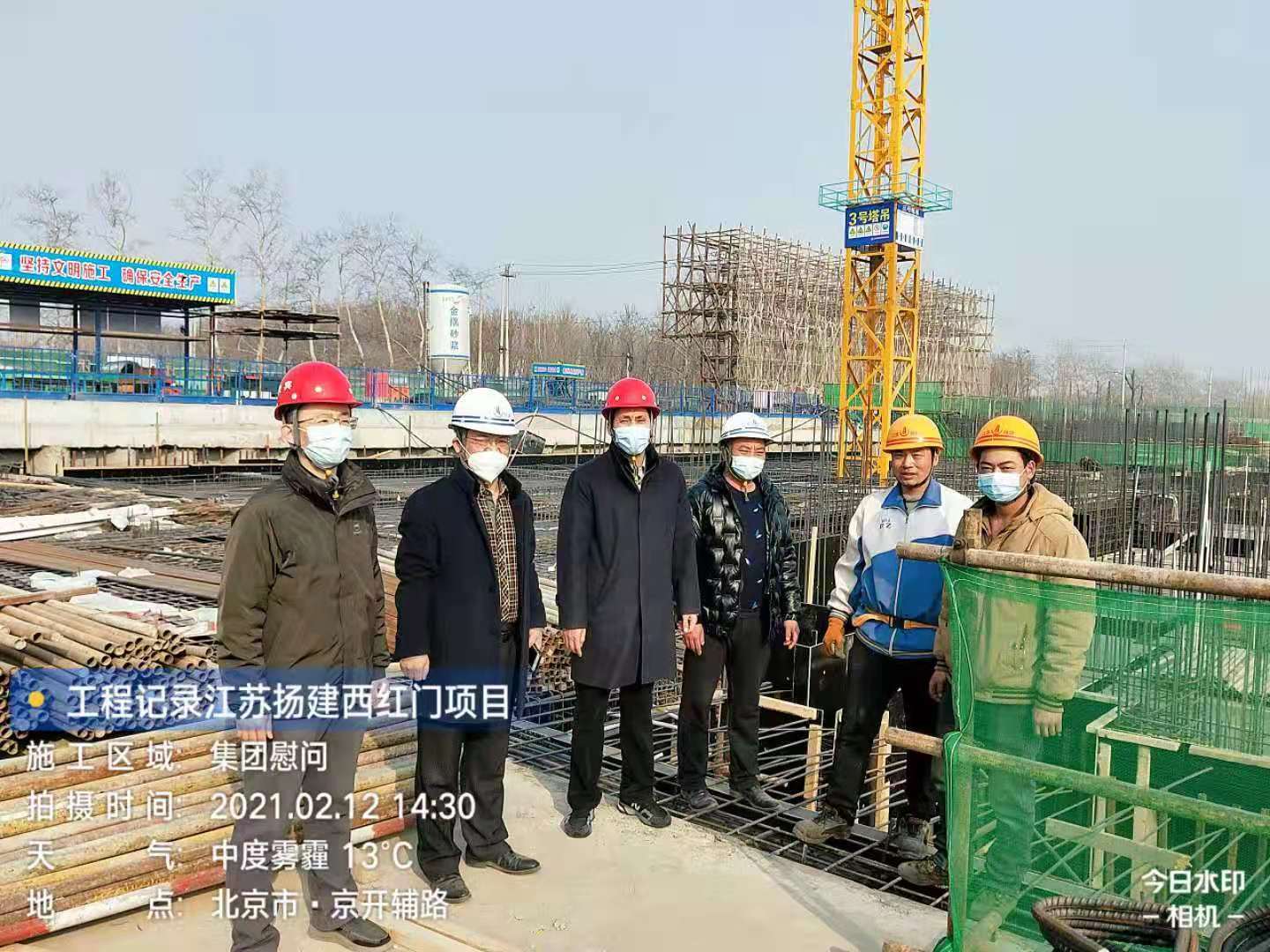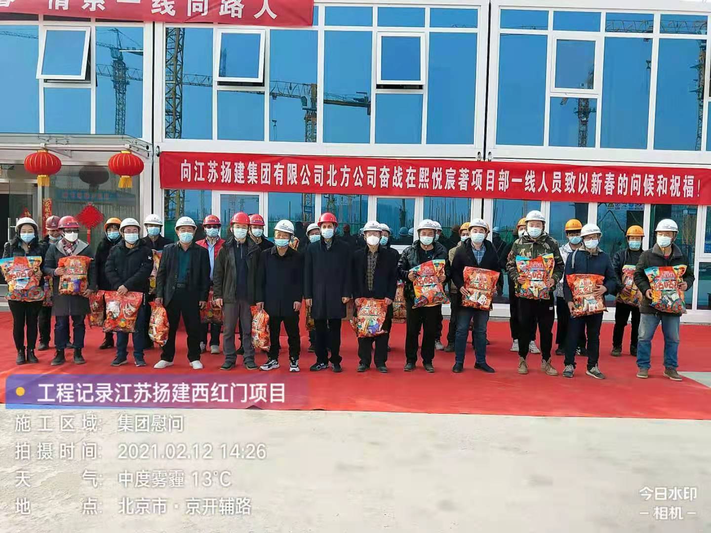 揚(yáng)建網(wǎng)訊 2月12日,農(nóng)歷大年初一,正是萬(wàn)家團(tuán)聚、喜慶佳節(jié)的時(shí)候,江蘇省人民政府駐北京辦事處建筑管理處處長(zhǎng)錢明、副處長(zhǎng)程剛走進(jìn)北京熙悅宸著項(xiàng)目部,看望慰問春節(jié)期間響應(yīng)國(guó)家就地過年號(hào)召、仍?shī)^戰(zhàn)在一線的400多名揚(yáng)建建設(shè)者,為在寒冷冬日下堅(jiān)守在生產(chǎn)一線的建設(shè)者們送上暖心年貨。北方公司副總經(jīng)理吳勇陪同慰問。