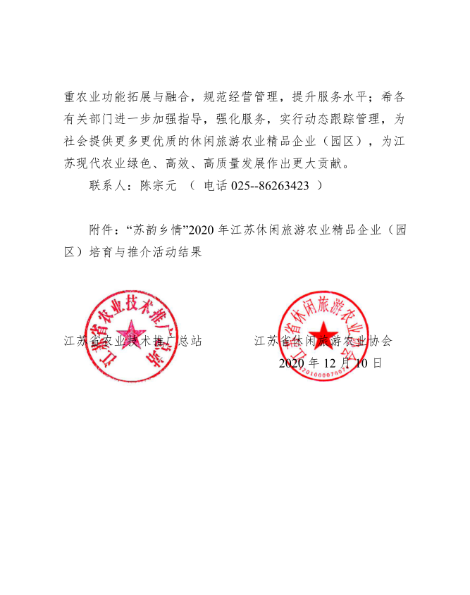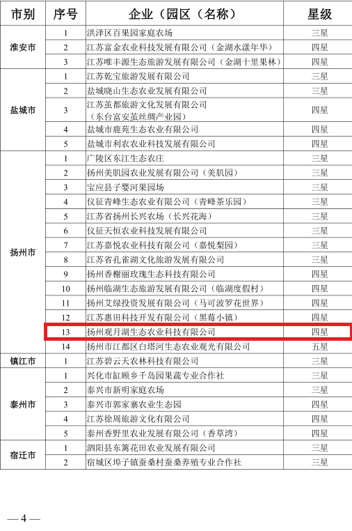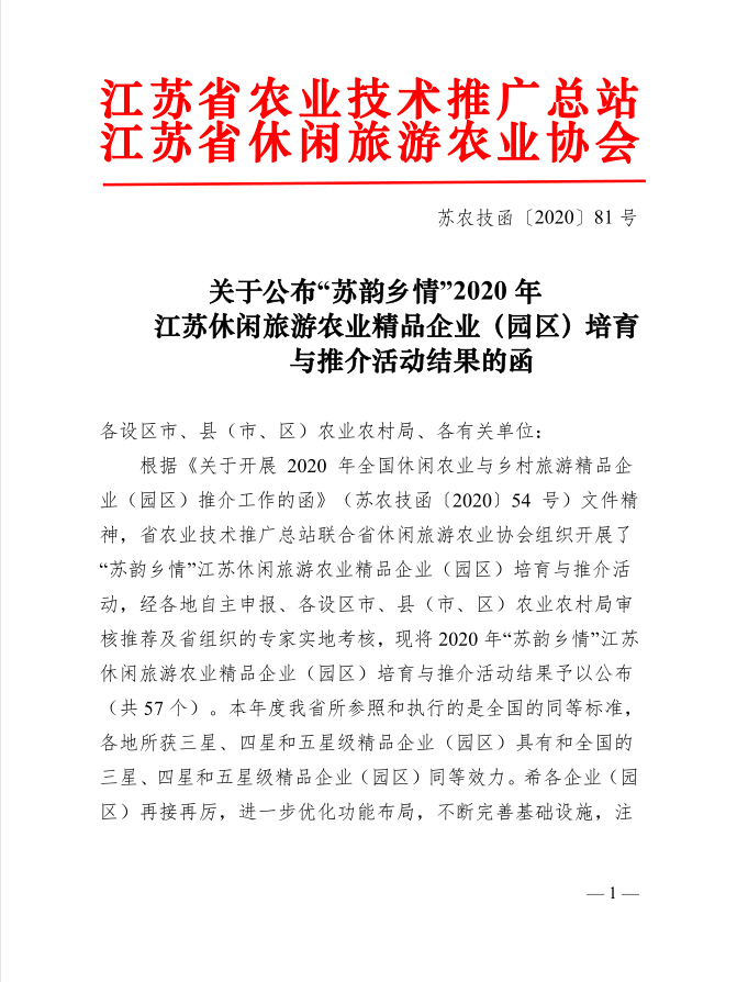 揚(yáng)建網(wǎng)訊 日前,省農(nóng)業(yè)技術(shù)推廣總站、休閑旅游農(nóng)業(yè)協(xié)會(huì)聯(lián)合下發(fā)文件,揚(yáng)州市觀月湖生態(tài)農(nóng)業(yè)科技有限公司順利通過“蘇韻鄉(xiāng)情”2020年江蘇休閑旅游農(nóng)業(yè)精品企業(yè)(園區(qū))“四星”驗(yàn)收。該評(píng)星的通過,將為園區(qū)后期發(fā)展農(nóng)旅產(chǎn)業(yè)提供強(qiáng)有力的支持。