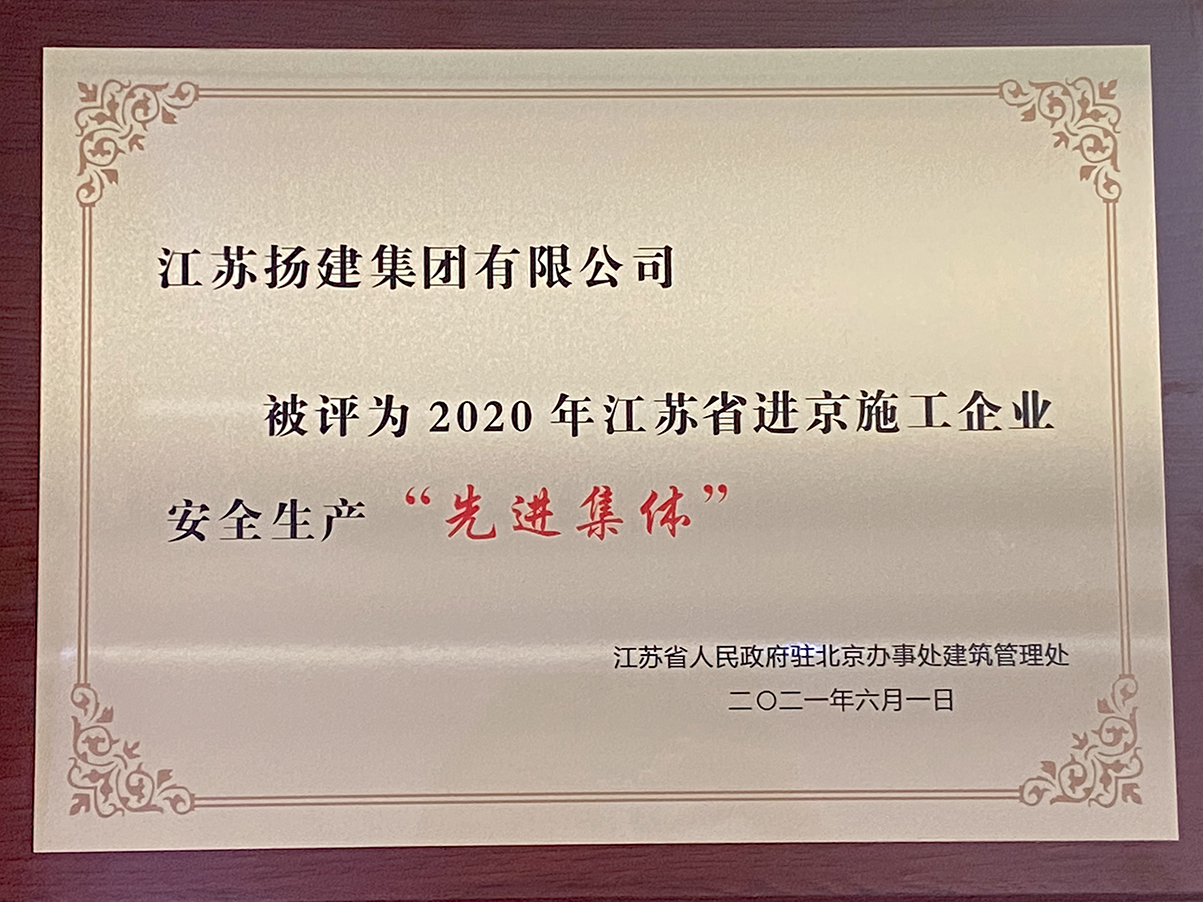 揚(yáng)建網(wǎng)訊 6月9日,江蘇省人民政府駐北京辦事處建筑管理處授予江蘇揚(yáng)建集團(tuán)有限公司2020年江蘇省進(jìn)京施工企業(yè)安全生產(chǎn)“先進(jìn)集體”稱號(hào)。