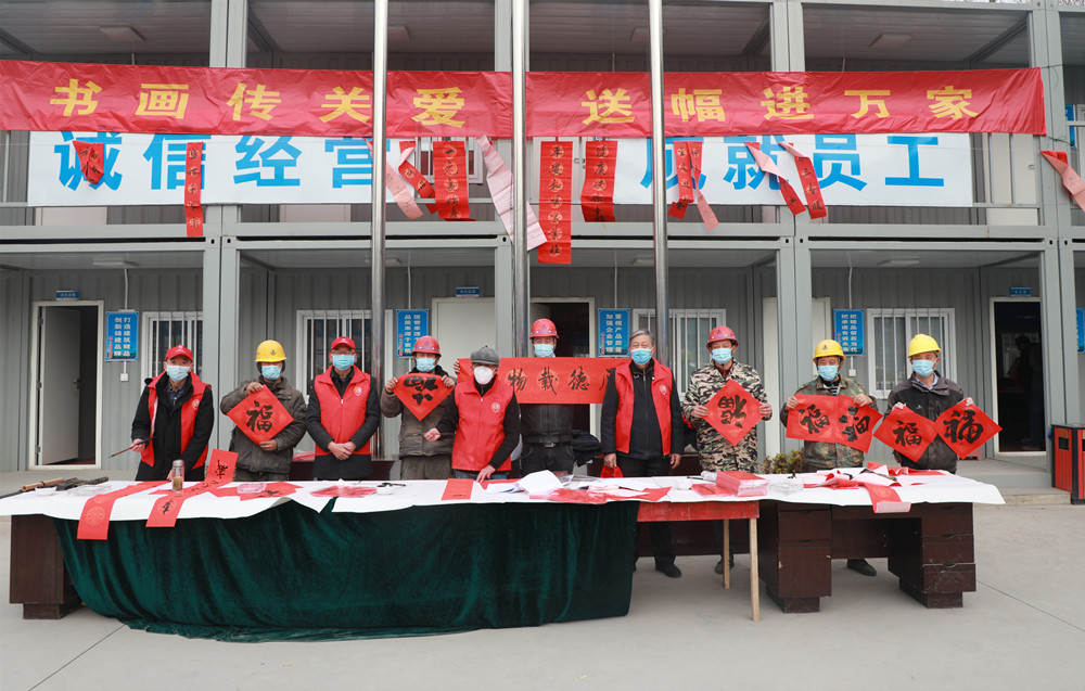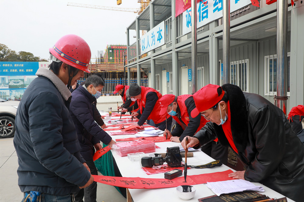 揚(yáng)建網(wǎng)訊 2022年1月20日上午,市人大機(jī)關(guān)老干部黨支部聯(lián)合揚(yáng)州市老干部書畫研究會(huì),來到我集團(tuán)項(xiàng)目管理三公司承建的揚(yáng)州大學(xué)生命科學(xué)大樓項(xiàng)目建設(shè)工地,為駐守工地的農(nóng)民工兄弟們寫春聯(lián)、送福字。在新年來臨之際,提前向他們送上新春祝福,為他們送吉祥,鼓干勁,感謝他們?yōu)?/span>“好地方”揚(yáng)州的城市建設(shè)和發(fā)展默默奉獻(xiàn)智慧與汗水。