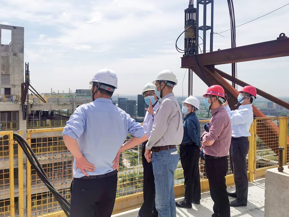 為確保鋼連廊的順利提升,施工期間,集團(tuán)領(lǐng)導(dǎo)和技術(shù)部門多次來(lái)現(xiàn)場(chǎng)進(jìn)行工作指導(dǎo),邀請(qǐng)了東南大學(xué)郭正興教授來(lái)項(xiàng)目對(duì)鋼連廊提升的準(zhǔn)備工作進(jìn)行檢查和驗(yàn)收。