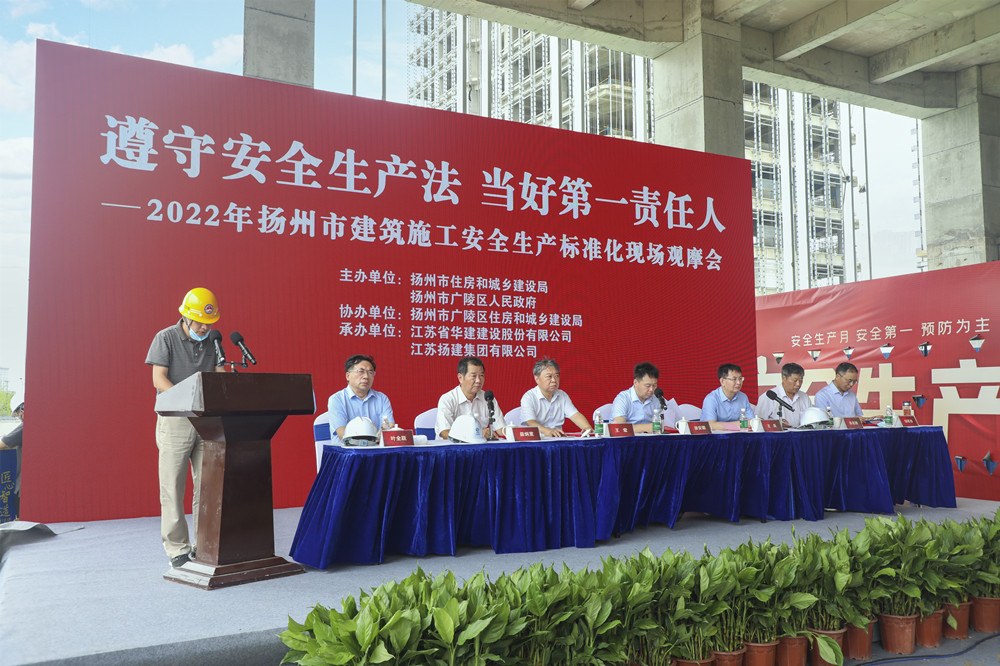 揚(yáng)建網(wǎng)訊 6月23日上午,揚(yáng)州市建筑施工安全生產(chǎn)標(biāo)準(zhǔn)化現(xiàn)場(chǎng)觀摩會(huì)在GZ137-A(建工科技園)項(xiàng)目盛大舉行,揚(yáng)州市市委常委、市委秘書(shū)長(zhǎng)、副市長(zhǎng)趙慶紅、市政府副秘書(shū)長(zhǎng)林寶榮、市住建局局長(zhǎng)徐安朝、副局長(zhǎng)薛炳寬、廣陵區(qū)副區(qū)長(zhǎng)王兵等領(lǐng)導(dǎo)蒞臨指導(dǎo),建工控股董事長(zhǎng)王宏、集團(tuán)公司總經(jīng)理鄒厚存等領(lǐng)導(dǎo)參加。