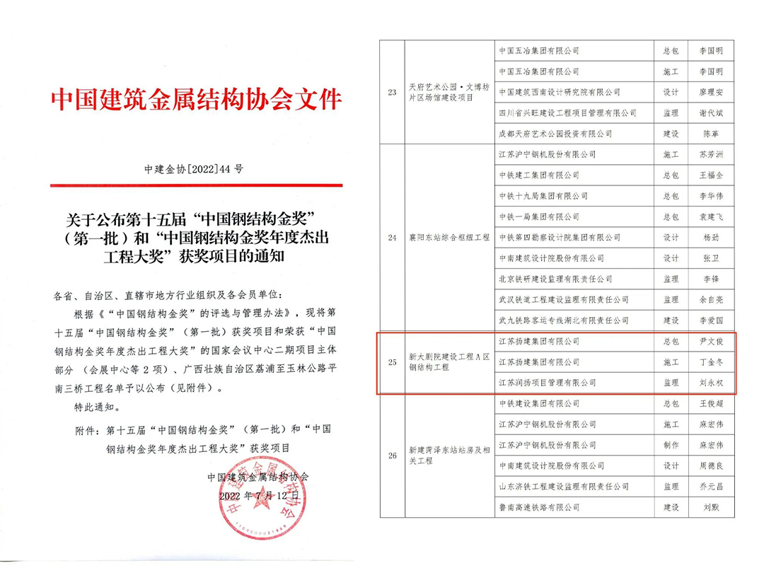 揚建網(wǎng)訊 7月12日,中國建筑金屬結(jié)構(gòu)協(xié)會公布了第十五屆第一批“中國鋼結(jié)構(gòu)金獎”獲獎名單,揚建集團鋼結(jié)構(gòu)公司所承建的運河大劇院建設(shè)工程A區(qū)鋼結(jié)構(gòu)工程被正式授予“中國鋼結(jié)構(gòu)金獎”榮譽稱號,并將在2023年全國行業(yè)大會上接受表彰。