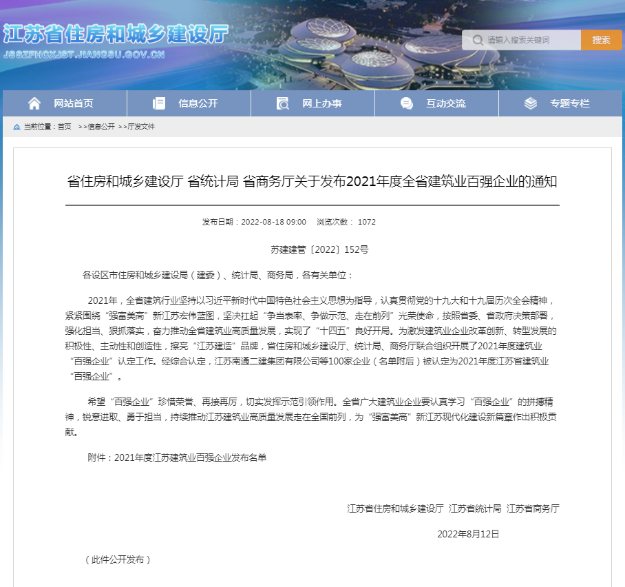 揚(yáng)建網(wǎng)訊 近日,江蘇省住房城鄉(xiāng)建設(shè)廳、統(tǒng)計(jì)局、商務(wù)廳聯(lián)合發(fā)布 “2021年度江蘇省建筑業(yè)百?gòu)?qiáng)企業(yè)”榜單,江蘇揚(yáng)建集團(tuán)有限公司位列綜合實(shí)力類(lèi)第12名。
