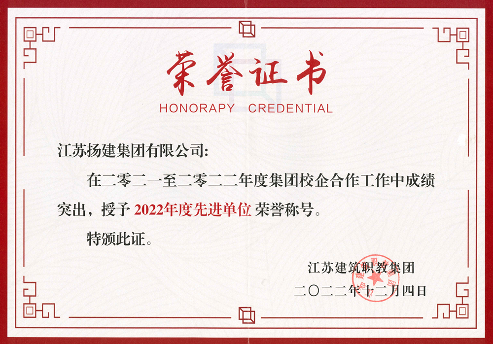 揚(yáng)建網(wǎng)訊 近日,江蘇建筑職教集團(tuán)召開了2022年年會,此次年會肯定了我集團(tuán)在學(xué)生就業(yè)、人才培養(yǎng)、技術(shù)創(chuàng)新、社會服務(wù)、文化傳承等工作中取得的成績,授予我集團(tuán) “2022年度校企合作先進(jìn)單位”榮譽(yù)稱號。
