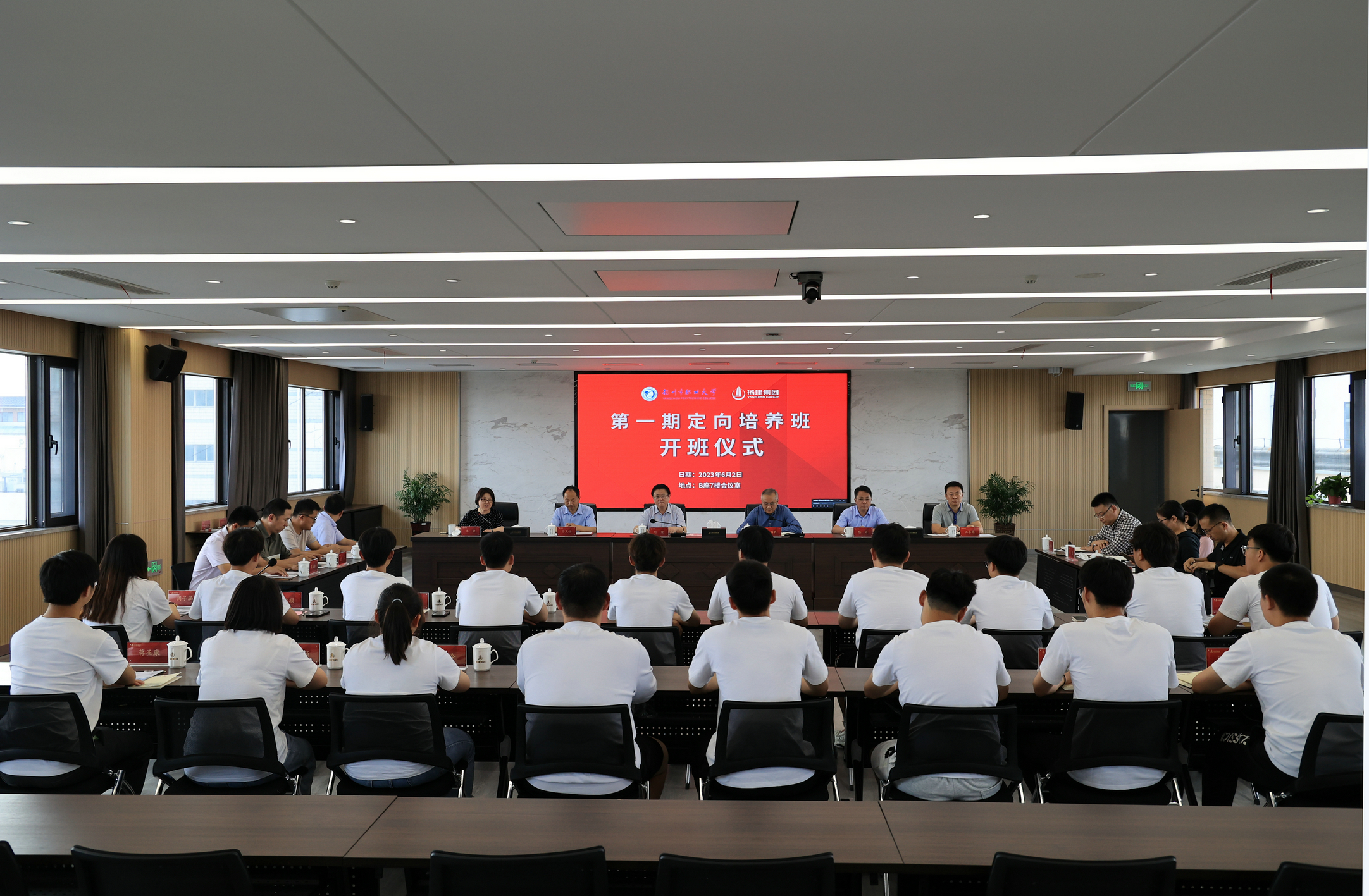 揚建網(wǎng)訊 6月2日下午,揚州市職業(yè)大學“揚建班”開班儀式在集團總部B座7樓會議室隆重舉行。該班為我集團與揚州市職業(yè)大學校企合作項目,旨在定向培養(yǎng)建筑業(yè)發(fā)展所需專業(yè)人才。集團黨委副書記呂國兵、陳滸、揚州職大副校長劉宏、職大土木工程學院書記呂凡任、院長王欣等出席,校企雙方相關(guān)老師、工作人員及第一期“揚建班”全體學員參加。