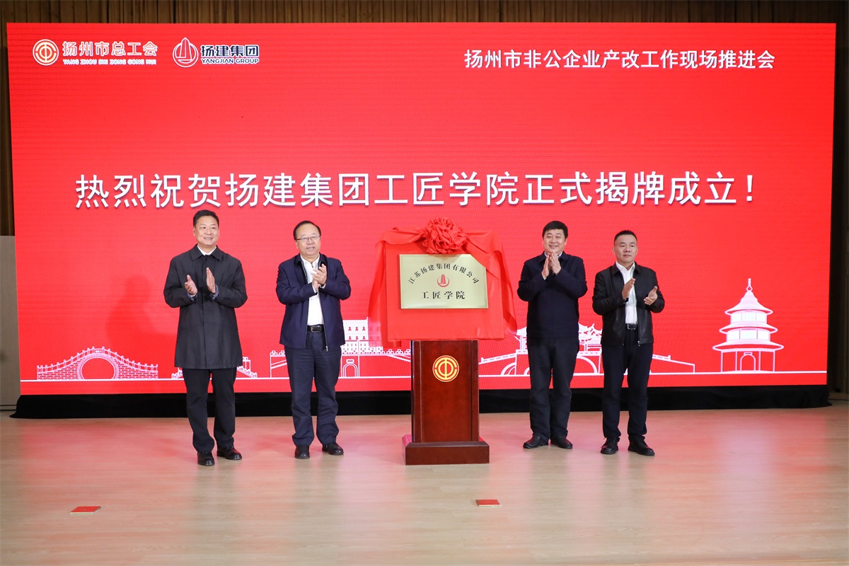 韓方、蔣元峰、楊浩、康往東、劉海斌等領(lǐng)導(dǎo)為新成立的揚(yáng)建工匠學(xué)院揭牌,并向第一屆“揚(yáng)建工匠”頒發(fā)榮譽(yù)證書。