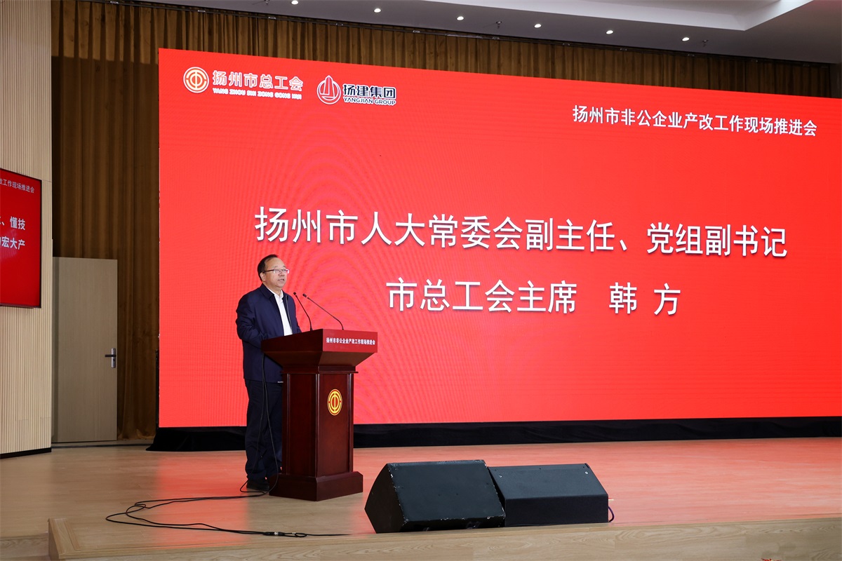 韓方在作總結(jié)講話時(shí)指出,召開推進(jìn)會(huì)旨在進(jìn)一步落實(shí)習(xí)近平總書記在同中華全國總工會(huì)新一屆領(lǐng)導(dǎo)班子成員集體談話時(shí)的重要講話精神以及中國工會(huì)十八大精神,促進(jìn)全市非公企業(yè)產(chǎn)改工作擴(kuò)面提質(zhì)增效。他高度評(píng)價(jià)了揚(yáng)建集團(tuán)產(chǎn)改工作所起到的示范引領(lǐng)作用,對(duì)全市非公企業(yè)產(chǎn)改工作提出三點(diǎn)要求:一是提高站位,充分認(rèn)識(shí)推動(dòng)非公企業(yè)產(chǎn)改工作的重要意義。二是聚焦重點(diǎn),以更大力度推動(dòng)非公企業(yè)產(chǎn)改工作取得實(shí)效。三是統(tǒng)籌資源,凝聚推進(jìn)非公企業(yè)產(chǎn)改工作合力。在市委市政府的堅(jiān)強(qiáng)領(lǐng)導(dǎo)下,守正創(chuàng)新、發(fā)力奮進(jìn),實(shí)干爭先、團(tuán)結(jié)奮斗,鍥而不舍推進(jìn)全市非公企業(yè)產(chǎn)改工作取得新突破、結(jié)出新碩果,為全面推進(jìn)中國式現(xiàn)代化揚(yáng)州新實(shí)踐做出更大貢獻(xiàn)。