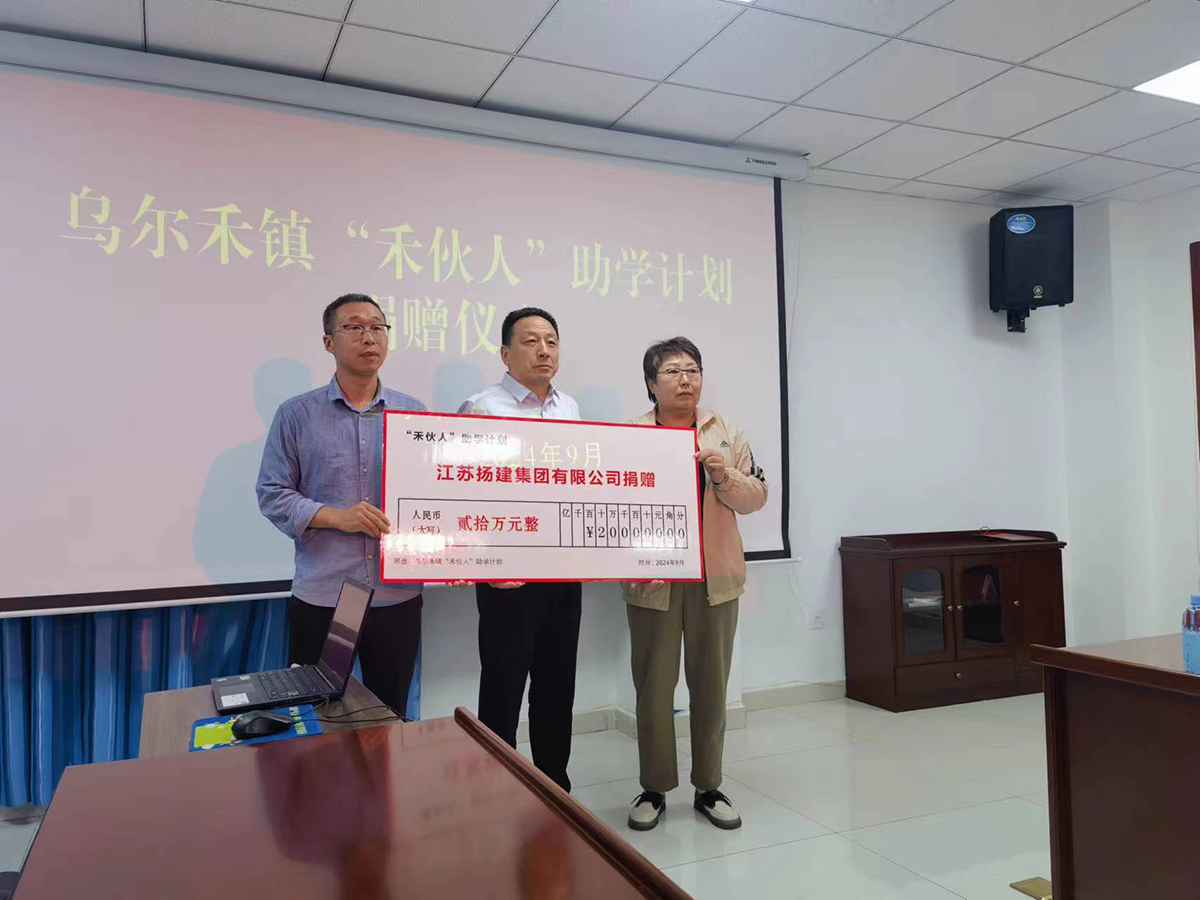 揚(yáng)建網(wǎng)訊 9月13日下午,新疆烏爾禾鎮(zhèn)“禾伙人”助學(xué)計(jì)劃捐贈(zèng)儀式在烏爾禾鎮(zhèn)政府三樓會(huì)議室隆重舉行。江蘇揚(yáng)建集團(tuán)有限公司副總經(jīng)理、工會(huì)主席劉海斌同志代表揚(yáng)建集團(tuán)應(yīng)邀出席、揚(yáng)建集團(tuán)新疆分公司相關(guān)負(fù)責(zé)同志共同參加。