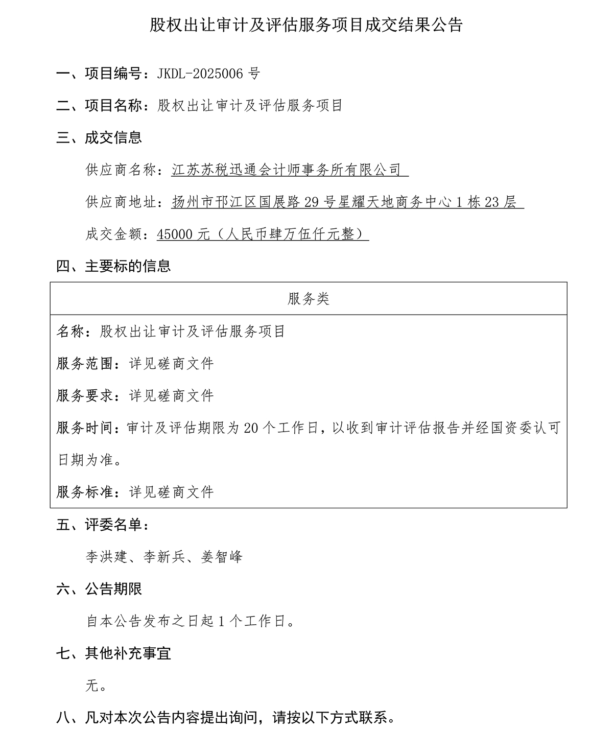 股權(quán)出讓審計(jì)及評(píng)估服務(wù)項(xiàng)目成交結(jié)果公告